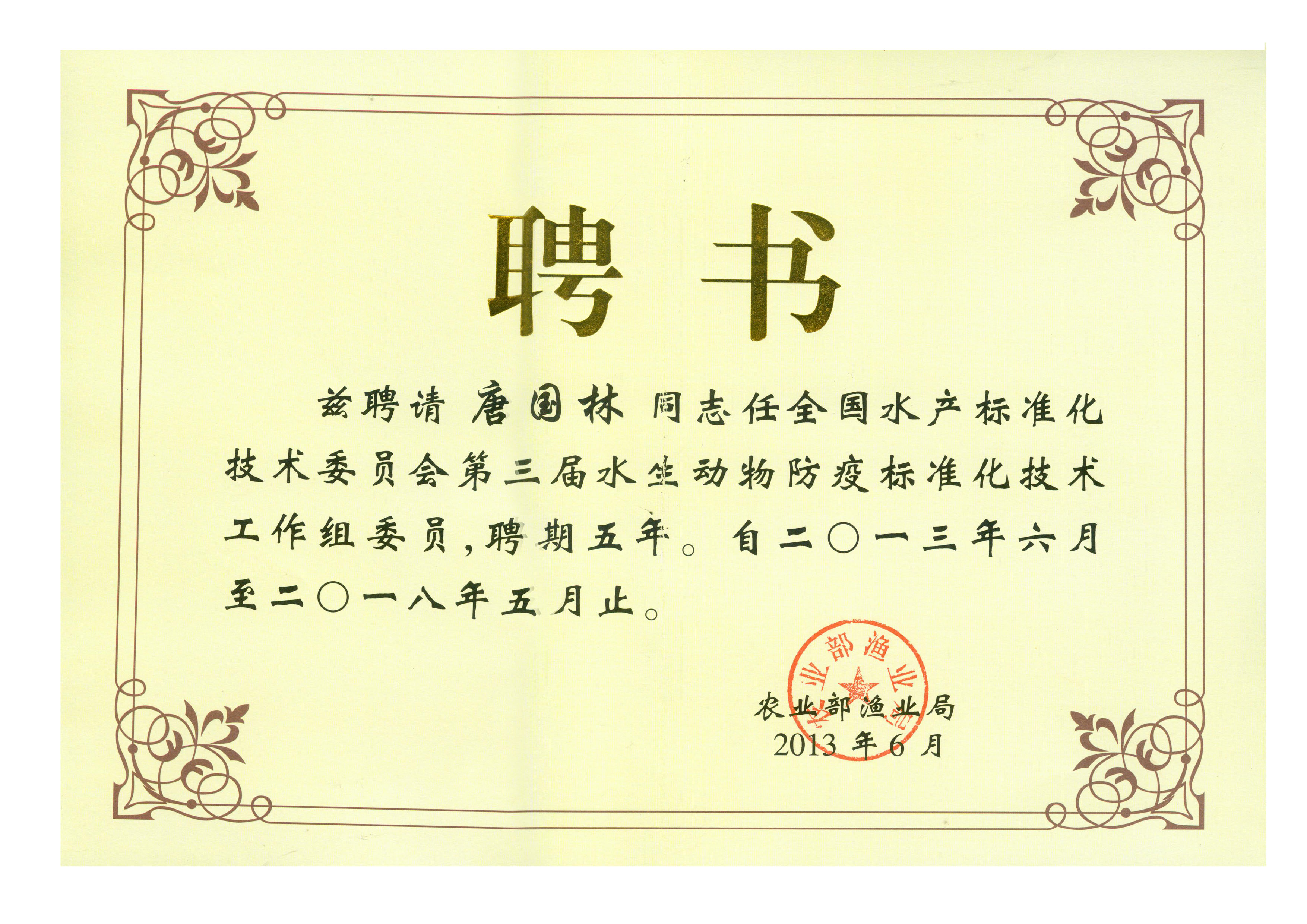 2013年6月公司技術(shù)帶頭人唐國林先生被聘為全國水產(chǎn)標(biāo)準(zhǔn)化技術(shù)委員會(huì)第三屆水生動(dòng)物防疫標(biāo)準(zhǔn)化技術(shù)工作組委員。