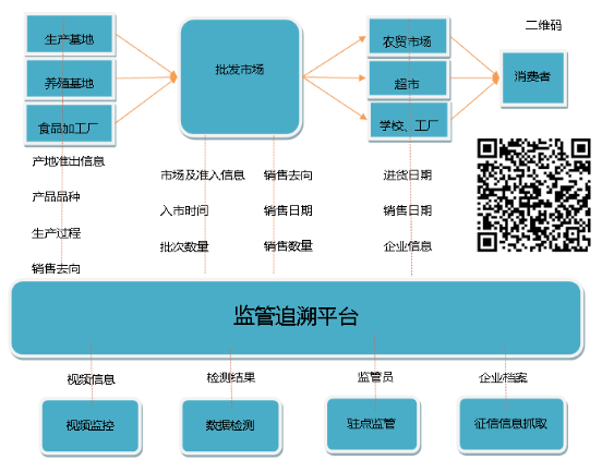 企業(yè)追溯平臺利用移動互聯(lián)網(wǎng)、物聯(lián)網(wǎng)、大數(shù)據(jù)和二維碼等信息技術(shù),通過信息采集、數(shù)據(jù)傳輸和信息查詢等功能,建立農(nóng)產(chǎn)品從生產(chǎn)、加工、儲運(yùn)到銷售的全程可追溯體系。同時通過與政府部門信息服務(wù)系統(tǒng)的數(shù)據(jù)對接,提供實時檢測監(jiān)控,動態(tài)預(yù)測預(yù)警等監(jiān)督管理功能。